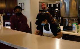 BC Dining workers prepare drinks and food at Hillside Cafe on Lower Campus.