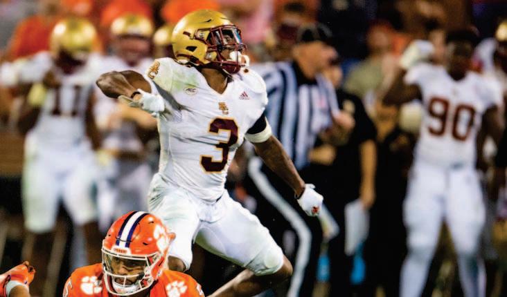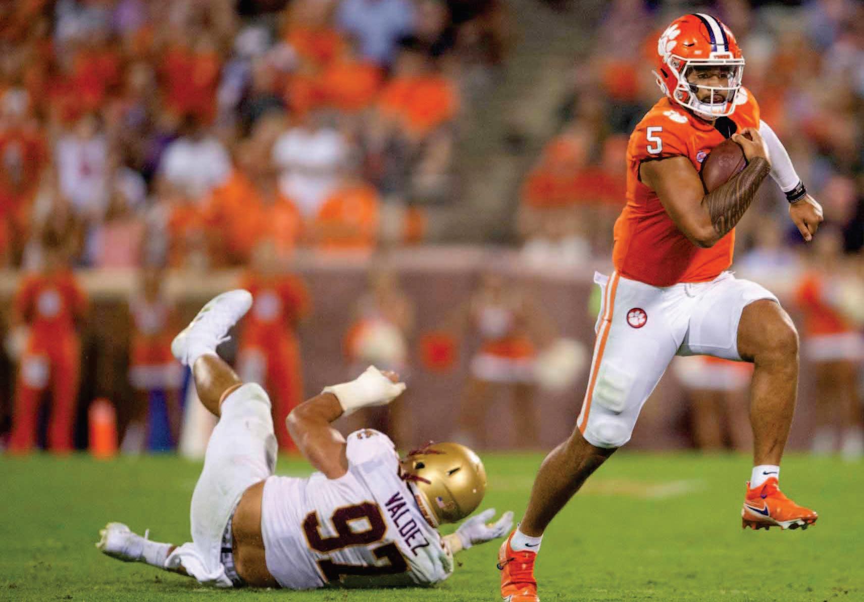 CLEMSON, S.C. — Boston College football quarterback Dennis Grosel looked downfield from the Clemson 36-yard line with 1:48 left on the clock. BC was down by six. He needed a perfect drive. Alec Lindstrom snapped the ball, and soon it was in Zay Flowers’ hands at the 49-yard line. On the next play, Grosel hit Travis Levy, who quickly darted out of bounds. Then he did it again, and again. Five completions later, Grosel found himself on the 11-yard line with a first down. Lindstrom snapped the ball, but this time it sailed through Grosel’s hands and landed on the turf. A few confusing seconds later, the refs signaled back downfield and Clemson had possession. Death Valley erupted in an 80,000-strong wall of noise as a destitute BC walked off the field, helpless without any timeouts remaining. The scoreboard flashed 19–13, Clemson.