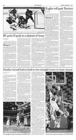 After a dominant 5-1 road win over archrival BU on Friday, the Boston College men’s hockey team looked to avoid a letdown against 0 Army winless Army. Boston College 11 Ye t t h e r e was no such letdown for the Eagles against the Black Knights as BC posted an impressive 11 goals and had two goalies combine for a shutout. Ten different Eagles scored goals on the afternoon. Sunday’s game also marked the first time BC has scored 11 goals since a matchup against Holy Cross on Nov. 19, 1984. The Eagles were sporting shuffled lines to start the game with sophomore Peter McMullen and freshman Matthew Gaudreau seeing their first game action of the season. Gaudreau and McMullen were on the fourth line while Destry Straight and Michael Sit sat out. While Gaudreau was making his debut, his older brother Johnny Gaudreau was continuing to add to his collegiate hockey credentials. The elder Gaudreau opened the barrage of scoring with a power play tally at four minutes into the first. Johnny was tripped by Army’s Garret Peterson,