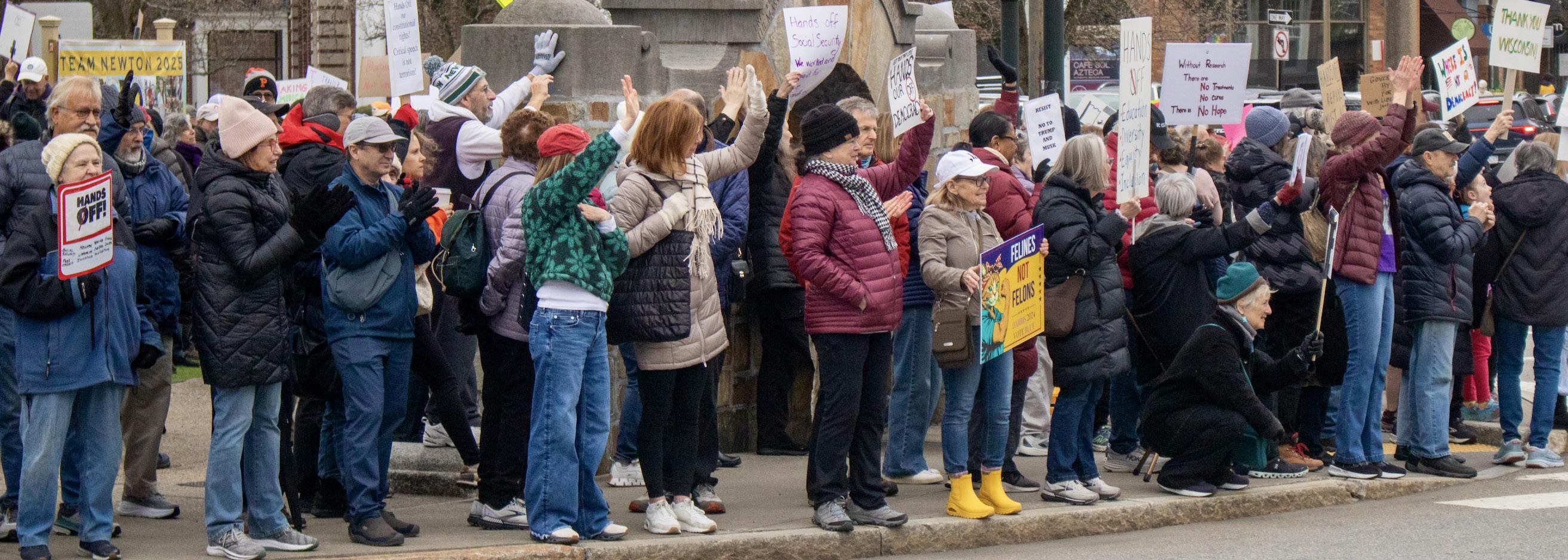 On Saturday afternoon, Newton residents stood out at the intersection of Beacon and Centre Street in Newton Centre as part of nationwide “Hands Off” demonstrations.