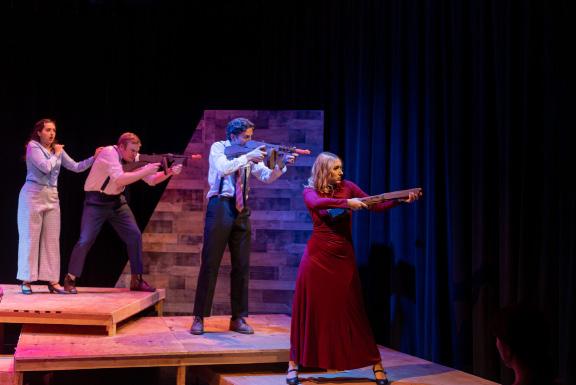 After Bonnie Parker falls in love with criminal Clyde Barrow, they commit a series of bank robberies and quickly climb their way to becoming the South’s most-wanted criminals. The play begins with young Bonnie (Bridget Ewing, MCAS ’28) belting her desire to be famous.