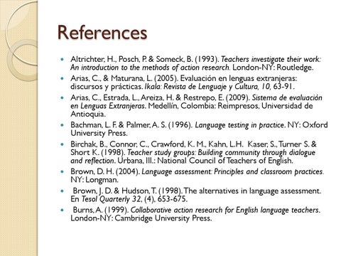 Altrichter, H., Posch, P. & Someck, B. (1993). Teachers investigate their work: An introduction to the methods of action research. London-NY: Routledge. Arias, C., & Maturana, L. (2005). Evaluación en lenguas extranjeras: discursos y prácticas. Ikala: Revista de Lenguaje y Cultura, 10, 63-91. Arias, C., Estrada, L., Areiza, H. & Restrepo, E. (2009). Sistema de evaluación en Lenguas Extranjeras. Medellín, Colombia: Reimpresos, Universidad de Antioquia. Bachman, L. F. & Palmer, A. S. (1996). Language testing in practice. NY: Oxford University Press. Birchak, B., Connor, C., Crawford, K. M., Kahn, L.H. Kaser, S., Turner S. & Short K. (1998). Teacher study groups: Building community through dialogue and reflection. Urbana, Ill.: National Council of Teachers of English. Brown, D. H. (2004). Language assessment: Principles and classroom practices. NY: Longman. Brown, J. D. & Hudson, T. (1998). The alternatives in language assessment. En Tesol Quarterly 32, (4), 653-675. Burns, A. (1999). Collaborative action research for English language teachers. London-NY: Cambridge University Press.