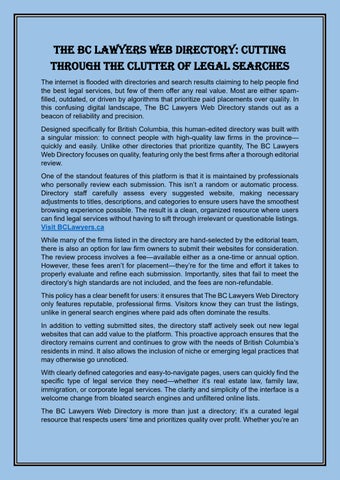 BC Lawyers was created to provide a highly selective, human edited directory of the British Columbia’s best law firms, arranging them in such a manner that its users can find what they are looking for quickly and easily, without the spam that is so prevalent elsewhere.