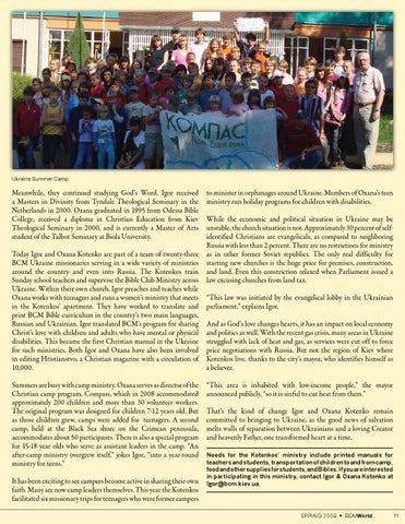 to minister in orphanages around Ukraine. Members of Oxana’s teen ministry run holiday programs for children with disabilities. While the economic and political situation in Ukraine may be unstable, the church situation is not. Approximately 30 percent of selfidentified Christians are evangelicals, as compared to neighboring Russia with less than 2 percent. There are no restrictions for ministry as in other former Soviet republics. The only real difficulty for starting new churches is the huge price for premises, construction, and land. Even this constriction relaxed when Parliament issued a law excusing churches from land tax. “This law was initiated by the evangelical lobby in the Ukrainian parliament,” explains Igor. And as God’s love changes hearts, it has an impact on local economy and politics as well. With the recent gas crisis, many areas in Ukraine struggled with lack of heat and gas, as services were cut off to force price negotiations with Russia. But not the region of Kiev where Kotenkos live, thanks to the city’s mayor, who identifies himself as a believer. “This area is inhabited with low-income people,” the mayor announced publicly, “so it is sinful to cut heat from them.” That’s the kind of change Igor and Oxana Kotenko remain committed to bringing to Ukraine, as the good news of salvation melts walls of separation between Ukrainians and a loving Creator and heavenly Father, one transformed heart at a time. Needs for the Kotenkos’ ministry include printed manuals for teachers and students, transportation of children to and from camp, food and other supplies for students, and Bibles. If you are interested in participating in this ministry, contact Igor & Oxana Kotenko at Igor@bcm.kiev.ua.