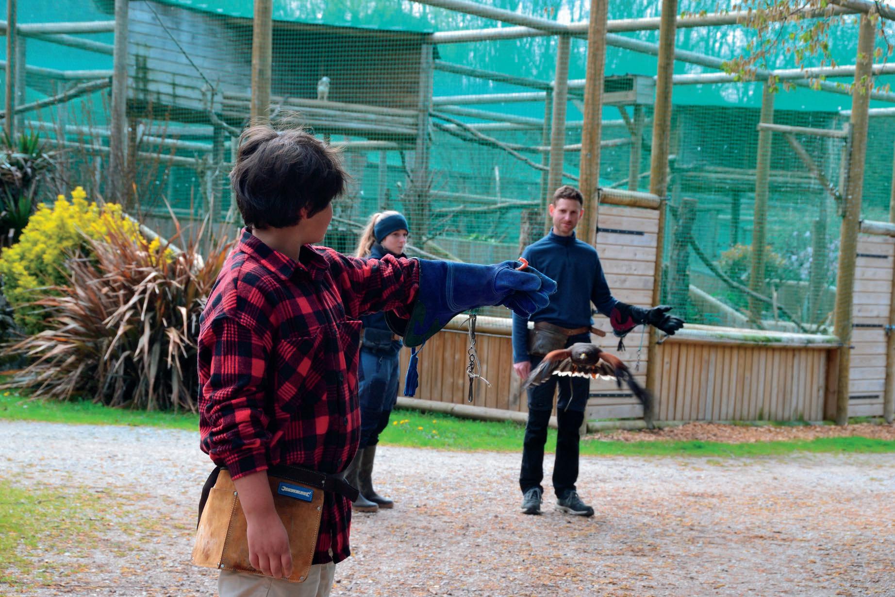 En cette belle après-midi printanière, Eva, biologiste et responsable du parc nous accueille pour cette première initiation. À ses côtés, Chloé fauconnière et Alexis, stagiaire. Dans cette nouvelle aventure, je suis accompagnée par Marthinus -alias kiki- 10 ans, fasciné depuis toujours par les oiseaux. Nous voilà donc partis pour une demi-heure de stage à la découverte du métier de fauconnier que nous allons incarner en interagissant avec plusieurs espèces. Sensations fortes et émotions garanties !