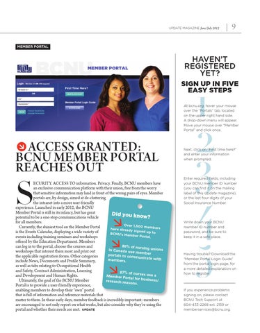 ecurity. Access to information. Privacy. Finally, BCNU members have an exclusive communication platform with their union, free from the worry that sensitive information may land in front of the wrong pairs of eyes. Member portals are, by design, aimed at de-cluttering the intranet into a more user-friendly experience. Launched in early 2012, the BCNU Member Portal is still in its infancy, but has great Did you kno w? potential to be a one-stop communications vehicle for all members. Over 1,500 members Currently, the shiniest tool on the Member Portal have alread y signed up is the Events Calendar, displaying a wide variety of to BCNU’s Mem ber Portal. events including training seminars and workshops offered by the Education Department. Members 80% of nursin can log in to the portal, choose the courses and g unions in Canada us workshops that interest them most and print out e member portals to co the applicable registration forms. Other categories mmunicate w ith members. include News, Documents and Profile Summary, as well as tabs relating to Occupational Health and Safety, Contract Administration, Learning 87% of nurses use a and Development and Human Rights. Member Port al for busine ss/ Ultimately, the goal of the BCNU Member research reas ons. Portal is to provide a user-friendly experience, enabling members to develop their “own” portal that is full of information and reference materials that matter to them. In these early days, member feedback is incredibly important: members are encouraged to not only report on what works, but also consider why they’re using the portal and whether their needs are met. update