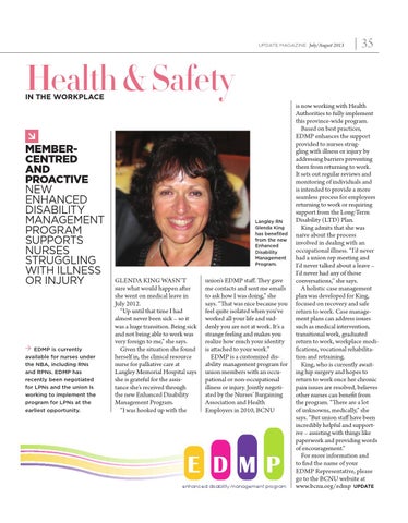 union’s EDMP staff. They gave me contacts and sent me emails to ask how I was doing,” she says. “That was nice because you feel quite isolated when you’ve worked all your life and suddenly you are not at work. It’s a strange feeling and makes you realize how much your identity is attached to your work.” EDMP is a customized disability management program for union members with an occupational or non-occupational illness or injury. Jointly negotiated by the Nurses’ Bargaining Association and Health Employers in 2010, BCNU