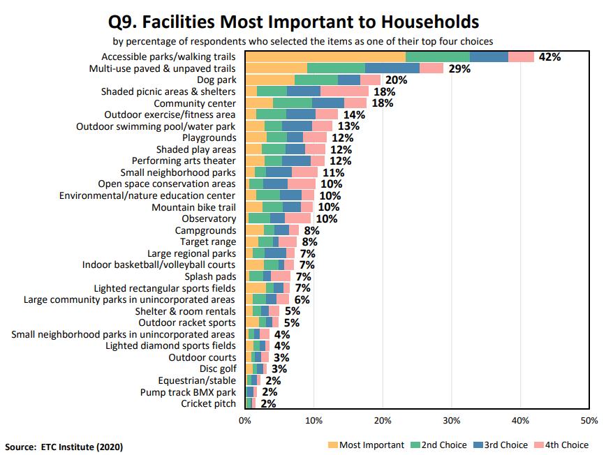Of the unmet needs selected in the last question, the four most important facilities and amenities chosen by respondents were Accessible parks/walking trails (38%), Multi-use paved & unpaved trails (33%), Mountain bike trail (20%), and Playgrounds (18%). When considering the lowest responses to this question, it is important to understand that in many instances these are facilities that are important, but are already being provided, so there is not a demonstrated need. Additionally, these facilities and amenities may be provided by local cities and towns within their parks and recreation departments, rather than being expected to be provided by the Division.