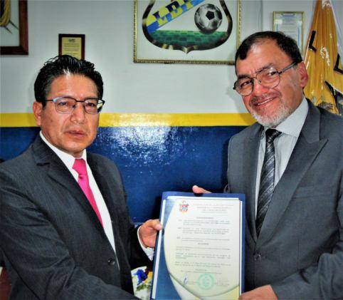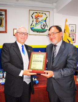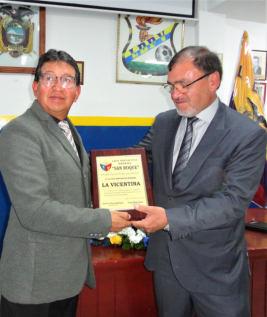 Carlos Gordón, presidente de Liga Las Casas (Izq.) recibe una placa de reconocimiento a la labor profesional, asesoramiento y apoyo oportuno en la consecución de beneficios para el deporte barrial y en especial de Liga la Vicentina. Mauricio Salazar, presidente de, LDBV, le otorga el presente. Gordón, por su gestión y dinamismo ejecutivo, es potencial candidato para las próximas elecciones de la Federación de Ligas de Quito, que se vienen.