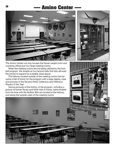 The Amino Center not only houses the Raven weight room and coaching offices but two large meeting rooms. When the meeting rooms are not being utilized by the football program, the double as two lecture halls that also allowed the school to expand its available class space. The hallway located outside of the meeting rooms has become a hall of honor for the program with a large display case and pictures of the Ravens HAAC Defensive and Offensive Players of the Year. Various pictures of the history of the program, including a picture of former Raven and NAIA Hall of Famer Jamie Mueller from his time with the Buffalo Bills are located in the hallway and along the outside walls of the meeting rooms.