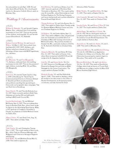 Earlene (Carlow) Wolters, ’61, wed James C. Wilson, ’60, May 5, 2007. Jim is retired from teaching with U.S.D. #409, Atchison, and Earlene retired as a chemist in June 2006, following a 40-year career with MGP Ingredients, Inc., Atchison.