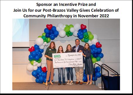 Powered by the Community Foundation, Brazos Valley Gives also gives businesses an opportunity to be involved in Brazos Valley Gives. Last year, Brazos Valley Gives awarded over $36,000 in sponsorship prizes to participating nonproÞts during a post-celebration event. Business leaders are empowered to come together to support causes closes to their hearts. Supporting Brazos Valley Gives is a great way to strengthen your corporate social responsibility efforts while engaging your employees and customers in a meaningful way. Local individuals, corporations and businesses can take part in sponsoring each hour of giving—to offer over $36,000 in incentive prizes for the participating nonproÞt raising the most donations per hour, or having the most donors, among other categories.