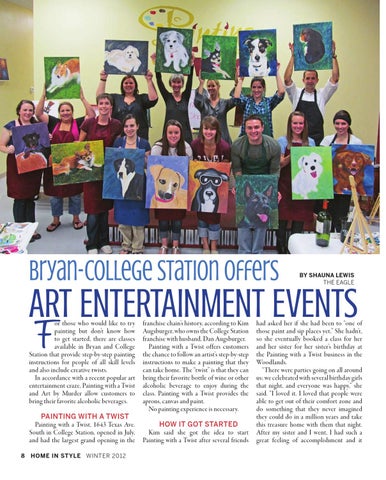 franchise chain’s history, according to Kim Augsburger, who owns the College Station franchise with husband, Dan Augsburger. Painting with a Twist offers customers the chance to follow an artist’s step-by-step instructions to make a painting that they can take home. The “twist” is that they can bring their favorite bottle of wine or other alcoholic beverage to enjoy during the class. Painting with a Twist provides the aprons, canvas and paint. No painting experience is necessary. How it got started Kim said she got the idea to start Painting with a Twist after several friends