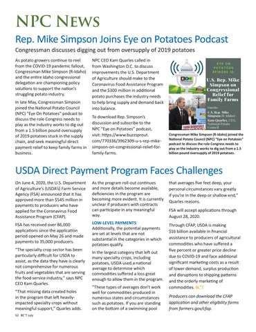 NPC CEO Kam Quarles called in from Washington D.C. to discuss improvements the U.S. Department of Agriculture should make to the Coronavirus Food Assistance Program and the $300 million in additional potato purchases the industry needs to help bring supply and demand back into balance. To download Rep. Simpson’s discussion and subscribe to the NPC “Eye on Potatoes” podcast, visit: https://www.buzzsprout. com/770336/3962309-u-s-rep-mikesimpson-on-congressional-relief-forfamily-farms.