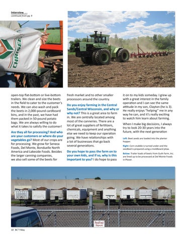 it on to my kids someday. I grew up with a great interest in the family operation and I can see the same attitude in my son, Clayton (he is 3). He really enjoys “helping” me in any way he can, and it’s really exciting to watch him learn about farming. When I make big decisions, I always try to look 20-30 years into the future, with the next generation Left: Beet seeds are loaded into the planter hopper. Right: Corn stubble is turned under and the seedbed is prepared using a moldboard plow. Below: Trailer loads of beets from Guth Farm, Inc. are lined up to be processed at Del Monte Foods in Plover.