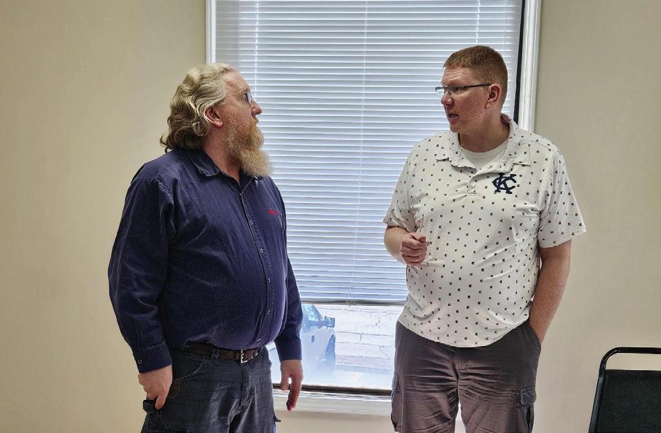 Nathaniel Larson (left) asks OSHA representative Brian Wood (right) a question.