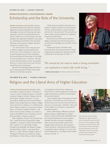 Scholarship and the Role of the University before she began her lecture, Harvard University President Drew Gilpin Faust acknowl edged that she had traveled the five miles from Cambridge to Chestnut Hill that day with some trepidation. She had not looked forward to fol lowing “a Mass for 20,000 at Fenway,” she said, alluding to the September celebration. Faust spoke on “Scholarship and the Role of the University,” reflecting on the purposes of higher education, and who it is meant to serve. “It is clear we have come a long way since Fr. McElroy sought to provide opportunities for the sons of Irish immigrants or even since Harvard President James Conant established the Harvard National Scholarships in the middle of the Great Depression,” said Faust. “We seek to serve talented students of every race, gender, ethnicity—as well as those from even the most limited financial circumstances.” But while acknowledging higher education’s role in fostering upward mobility, Faust called attention to its broader purposes. november