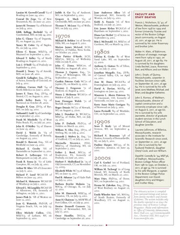 Michael B. Belden ’70 of Beverly Hills, MI, on August 6, 2011. Marion James McLeod, SCH, MEd’70, of Halifax, Nova Scotia, on October 20, 2010. Clare Patrice O’Keefe, SCH, MEd’70, MA’79, of Wellesley Hills on July 8, 2011. John C. Zinna, MBA’70, of Wellesley on August 28, 2011. Thomas J. Capano, Esq., ’71, JD’74, of Wilmington, DE, on September 19, 2011. Cynthia Paterno Cody NC’71 of Jupiter, FL, on March 15, 2011. Thomas J. Ferguson ’71 of Boxford, on August 4, 2011. Henry J. McKenna WCAS’71 of Malden of July 8, 2011. Joan Finnegan Walsh ’71 of Norfolk on July 1, 2011. Roger Dennis NC’72 of Newark, NY, on August 9, 2010. John J. Donahue Jr. WCAS’72, MEd’74, of Hollis, NH, on July 23, 2011. John P. Dufault, PhD’72, of Holden on March 22, 2011. William N. Elin, Esq., JD’72, of Stirling, NJ, on July 4, 2011. Kenneth J. Mulvey Jr., Esq., ’72 of Guilford, CT, on July 21, 2011. Marinella Nicewicz, FSSJ, MEd’72, of Hamburg, NY, on September 7, 2011. Esther J. Reed, MS’72, of Bradenton, FL, formerly of Peabody, on June 20, 2011. Herbert F. Mulholland Jr. ’73 of Old Greenwich, CT, on November 19, 2009. Elizabeth White NC’73 of Albany, NY, on June 15, 2011. Paul R. Athanas ’74 of Hyde Park on July 12, 2011. Barbara Bowler Malmin ’74, MA’74, of Chicago, IL, on July 17, 2011. John M. Hamrock, MEd’74, of Houston, TX, on July 13, 2011. Anne H. Chaisson ’75, MSW’88, of Fort Collins, CO, on July 31, 2011. Denise Donnell Connors ’75, MS’77, of Newmarket, NH, on July 17, 2011. Oscar Handlin, DHL’75, of Cambridge on September 20, 2011.