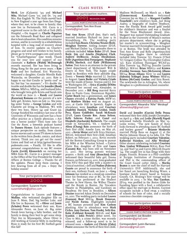class notes Merk, Lee (Calamis) ’99 and Michael Mita, Michael Carey ’00, and Dr. ’79 and Mrs. Ray English ’81. The Halls moved back to New England a year ago from San Diego, where they met, to be closer to family; they now live in Portsmouth, NH. Carra is a registered nurse in the cath lab at York (ME) Hospital. • On August 11, Charlie Papazian ran the Falmouth Road Race and collapsed due to heat exhaustion. His condition remains serious, and he is currently in a rehabilitation hospital with a long road of recovery ahead of him. To receive updates on Charlie’s progress and send well wishes to his family, please go to www.carepages.com and search for “CharliePapazian” (one word). Thank you for your love and support of our classmate. • Kathryn (Walsh) McDonough recently married. She has been living in Hong Kong for the past seven years. • Kate Rado and her husband, Eric Warzecha, welcomed a daughter, Coralie Mireille Rado Warzecha, on December 27, 2011. Kate is happy to say that Coralie is “pretty cool” so far, but has “no manners.” • It’s double the trouble and double the fun for Jennifer (Bunt) Adams, MEd’02, MEd’04, and husband John, who brought twin girls Krista and Sarah into the world on June 11. • Randy and Lauren (Kazarian) Romano are the parents of a new baby girl, Kristen, born on July 12. She joins big sister Taylor. • George Leydon and wife Charlotte are living in Madison, WI, with their two boys, Henry (4) and Grant (2). George finished his residency last year at the University of Wisconsin and now has a busy office practice as a family physician. • Are you a horror junkie? Then tune into Get Out the Room, a biweekly podcast hosted by Damen Hymes. Each episode features a unique perspective on media, from classic horror movies and current TV shows to horror in the written form (books, comics, and short stories). Think you can get out the room? Listen and find out at http://getouttheroom. podomatic.com. • Finally, I’d like to offer personal congratulations to my BC roomie Carrie (Levitt) Klemovitch on earning her MBA from BC. Carrie is a project manager in the Office of the Vice President for Student Affairs at Boston College. • Thanks for all the updates. Please keep them coming. I love hearing from all of you. • Enjoy the holiday season!