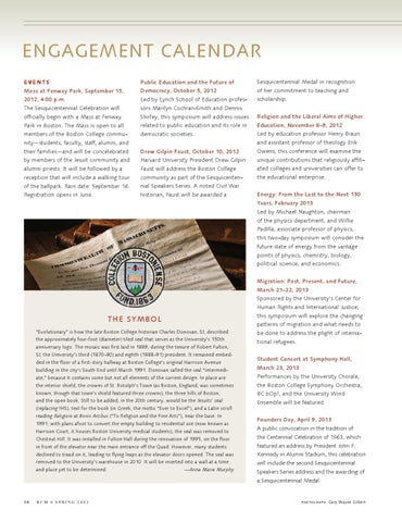 Energy: From the Last to the Next 150 Years, February 2013 Led by Michael Naughton, chairman of the physics department, and Willie Padilla, associate professor of physics, this two-day symposium will consider the future state of energy from the vantage points of physics, chemistry, biology, political science, and economics. Migration: Past, Present, and Future, March 21–22, 2013 Sponsored by the University’s Center for Human Rights and International Justice, this symposium will explore the changing