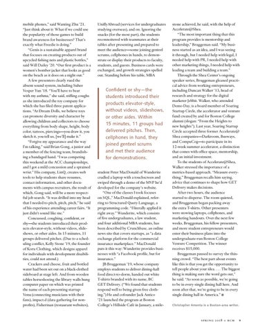 stone achieved, he said, with the help of Accelerate@Shea. “The most important thing that this program provides is mentorship and leadership,” Bruggeman said. “My business started as an idea, and I was seeing it through, but I needed help with legal, I needed help with PR, I needed help with other marketing things, I needed help with leading a team and building a team.” Through the Shea Center’s ongoing speaker series, Bruggeman gleaned practical advice from working entrepreneurs, including Duncan Walker ’13, head of research and strategy for the digital marketer Jebbit. Walker, who attended Demo Day, is a board member of Soaring Startup Circle, the accelerator and venture fund created by and for Boston College alumni (slogan: “From the Heights to new heights”). Last year, Soaring Startup Circle accepted three former Accelerate@ Shea companies—Darkroom, Busways, and CompuCog—to participate in its 12-week summer accelerator, a distinction that comes with office space, mentorship, and an initial investment. To the students of Accelerate@Shea, Walker stressed the importance of a metrics-based approach. “Measure everything,” Bruggeman recalls him saying, advice that continues to shape how GET Delivery makes decisions. After two hours, the audience started to disperse. The room quieted, and Bruggeman began packing away the extra T-shirts. Other presenters were stowing laptops, cellphones, and marketing handouts. Over the next few weeks, Bruggeman, his fellow presenters, and more student entrepreneurs would enter their business plans into the undergraduate-run Boston College Venture Competition. The winner receives $15,000. Bruggeman paused to survey the thinning crowd. “The best part about events like this is that you get the opportunity to tell people about your idea. . . . The biggest thing is making sure the word gets out,” he said. “As soon as possible, we’re going to be in every single dining hall here. And soon after that, we’re going to be in every single dining hall in America.” n Christopher Amenta is a Boston-area writer.