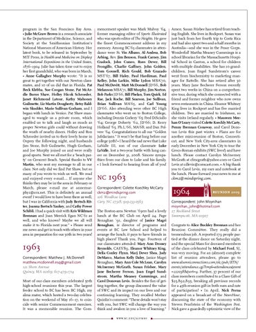 1964 Correspondent: John Moynihan moynihan_john@hotmail.com 27 Rockland Street Swampscott, MA 01907 Congrats to Alice Buckley Brennan and her Reunion Committee. They really did a tremendous job. A reported 179 people partied at the dinner dance on Saturday night, and the special Mass for deceased members of the class celebrated by Michael Ford, SJ, was very moving. For an (almost) complete list of reunion attendees, please go to www.alumniconnections.com/olc/pub/BTN/ events/attendance.cgi?tmpl=attendance&event =2220388&sort=4. Further, 37 percent of our class members contributed to a Class Gift of $25,892,895, breaking all previous records for a 45th reunion gift in both sum and rate of participation! • In April, Nick Perna appeared on a broadcast of the NewsHour, discussing the state of the economy with Steven Pearlstein of the Washington Post. Nick gave a guardedly optimistic view of the