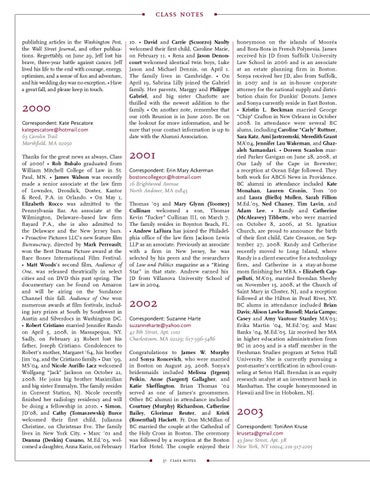 2000 Correspondent: Kate Pescatore katepescatore@hotmail.com 63 Carolin Trail Marshfield, MA 02050 Thanks for the great news as always, Class of 2000! • Rob Bubalo graduated from William Mitchell College of Law in St. Paul, MN. • James Walson was recently made a senior associate at the law firm of Lowndes, Drosdick, Doster, Kantor & Reed, P.A. in Orlando. • On May 1, Elizabeth Rocco was admitted to the Pennsylvania Bar. An associate at the Wilmington, Delaware–based law firm Bayard P.A., she is also admitted to the Delaware and the New Jersey bars. • Proactive Pictures LLC’s new feature film Bureaucracy, directed by Mark Perreault, won the Best Drama Picture award at the Bare Bones International Film Festival. • Matt Woods’s second film, Audience of One, was released theatrically in select cities and on DVD this past spring. The documentary can be found on Amazon and will be airing on the Sundance Channel this fall. Audience of One won numerous awards at film festivals, including jury prizes at South by Southwest in Austin and Silverdocs in Washington DC. • Robert Cristiano married Jennifer Rando on April 5, 2008, in Massapequa, NY. Sadly, on February 23 Robert lost his father, Joseph Cristiano. Condolences to Robert’s mother, Margaret ’64, his brother Jim ’04, and the Cristiano family. • Dan ’99, MS’04, and Nicole Aurillo Lacz welcomed Wolfgang “Jack” Jackson on October 21, 2008. He joins big brother Maximilian and big sister Emmalyn. The family resides in Convent Station, NJ. Nicole recently finished her radiology residency and will be doing a fellowship in 2010. • Simon, JD’08, and Cathy (Tomaszewski) Burce welcomed their first child, Julianna Christine, on Christmas Eve. The family lives in New York City. • Marc ’01 and Deanna (Deskin) Cusano, M.Ed.’03, welcomed a daughter, Anna Karin, on February