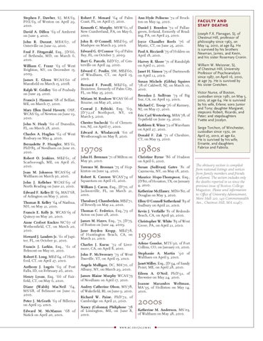 The obituary section is compiled from national listings and notices from family members and friends of alumni. The section includes only the deaths reported to us since the previous issue of Boston College Magazine. Please send information to: Office of University Advancement, More Hall 220, 140 Commonwealth Ave., Chestnut Hill, MA 02467.