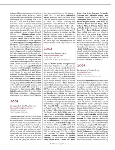 and one of her recent cases was featured on NBC’s Dateline. Andrea works as a PR consultant and has had multiple TV appearances, including on the CBS Morning Show in her role as a New York City–based fitness instructor. Nicole is married and recently had her first baby, a boy named Alexander. Myrna was recently promoted to a new position as a planner at West Elm. Kerry is a state health policy advisor at Manatt, Phelps & Phillips, LLP. • Elisabeth Sullivan married Matthew Greaney on October 27, 2007, in Hingham. • Krista Zilnicki married Richard Drew in Bridgehampton, NY, on September 13. • Thomas Joyce married Megan Meehan at St. Patrick’s Church in Stoneham. Thomas is now director of men’s basketball operations at Boston University. • Megan Gerson married Andrew Rhodes on July 19, 2008, in Washington DC. After honeymooning in Tanzania, they returned to Washington to live and work. • Joe Doumar married Jeannine Blake on November 1, 2008, in Merrick, NY. • On June 28, Mike and Katie Richter Long welcomed their first child, Charles Michael. The family lives in New Jersey. • Mike and Megan Collier Reilly welcomed their first child, John “Jack” Patrick, on July 20, 2008. The family lives in Brighton. • On August 18, Mary and Matt Warner welcomed their first child, Alexandra Marion. • After moving back to Boston from Ireland, Kate (Sullivan) MA’07 and Michael Sutphin MS’01 welcomed their first child, Molly Helene, on August 27. • Brian and Tricia (Navin) McBride welcomed their first child, Delaney Kate, on October 10, 2008. The family lives in Connecticut. • Dan ’97 and Ashley (Miller) Kalosieh welcomed their first child, Elizabeth Grace, on October 27. • Thank you for sharing your news with the rest of the class!