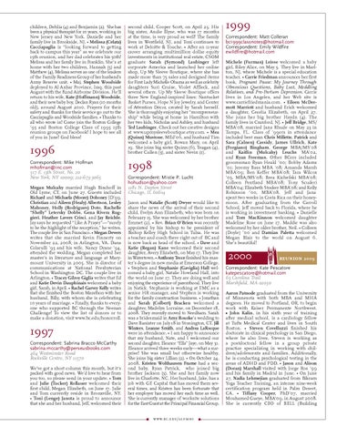 1998 Correspondent: Mistie P. Lucht hohudson@yahoo.com 1281 N. Dayton Street Chicago, IL 60614 Jason and Natalie (Scott) Dwyer would like to share the news of the arrival of their second child, Evelyn Ann Elizabeth, who was born on February 15. She was welcomed by her brother Emmet (2). • Rev. Brian O’Brien was recently appointed by his bishop to be president of Bishop Kelley High School in Tulsa. He was a teacher and coach there right out of BC and is now back as head of the school. • Dave and Katie (Regan) Kane welcomed their second daughter, Avery Elizabeth, on May 17. They live in Watertown. • Anthony Tecce finished his master’s degree in new media at Emerson College. • Stephen and Stephanie (Gaviglia) Hall welcomed a baby girl, Natalie Howland Hall, into the world on June 17. They are doing well and enjoying the experience of parenthood. They live in Natick. Stephanie is working at EMC as a senior HR manager, and Stephen is working for the family construction business. • Jonathan and Sarah (Colbert) Bracken welcomed a daughter, Madelyn Lorraine, on December 18, 2008. They recently moved to Needham. Sarah was a bridesmaid in Amy Rourke’s wedding to Dave Banister on July 18 in Stonington, CT. Jill Winters, Leanne Smith, and Andrea LaRocque were in attendance. • I am happy to announce that my husband, Nate, and I welcomed our second daughter, Eleanor “Ella” Jaye, on May 31. Eleanor arrived three weeks early—what a surprise! She was small but otherwise healthy. She joins big sister Lillian (2). • On October 24, 2008, Kristen Wolthausen Frame had a second baby, Ryan Patrick, who joined big brother Jackson (3). She and her family now live in Charlotte, NC. Her husband, Jake, has a job with GE Capital that has moved them several times, and Kristen has been fortunate that her employer has moved her each time as well. She is currently manager of worksite solutions for the East Coast at the Principal Financial Group.