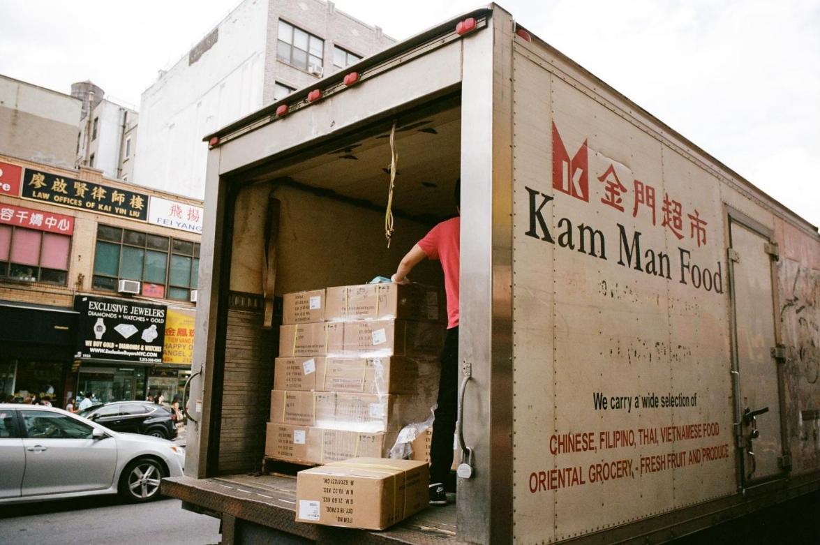 Delivery man unloading boxes in Manhattan's Chinatown. Taken on 35mm color film.