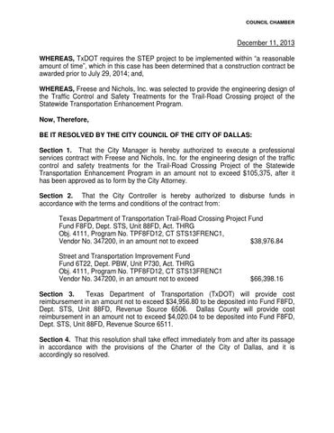 December 11, 2013 WHEREAS, TxDOT requires the STEP project to be implemented within “a reasonable amount of time�, which in this case has been determined that a construction contract be awarded prior to July 29, 2014; and, WHEREAS, Freese and Nichols, Inc. was selected to provide the engineering design of the Traffic Control and Safety Treatments for the Trail-Road Crossing project of the Statewide Transportation Enhancement Program. Now, Therefore, BE IT RESOLVED BY THE CITY COUNCIL OF THE CITY OF DALLAS: Section 1. That the City Manager is hereby authorized to execute a professional services contract with Freese and Nichols, Inc. for the engineering design of the traffic control and safety treatments for the Trail-Road Crossing Project of the Statewide Transportation Enhancement Program in an amount not to exceed $105,375, after it has been approved as to form by the City Attorney. Section 2. That the City Controller is hereby authorized to disburse funds in accordance with the terms and conditions of the contract from: Texas Department of Transportation Trail-Road Crossing Project Fund Fund F8FD, Dept. STS, Unit 88FD, Act. THRG Obj. 4111, Program No. TPF8FD12, CT STS13FRENC1, Vendor No. 347200, in an amount not to exceed $38,976.84 Street and Transportation Improvement Fund Fund 6T22, Dept. PBW, Unit P730, Act. THRG Obj. 4111, Program No. TPF8FD12, CT STS13FRENC1 Vendor No. 347200, in an amount not to exceed