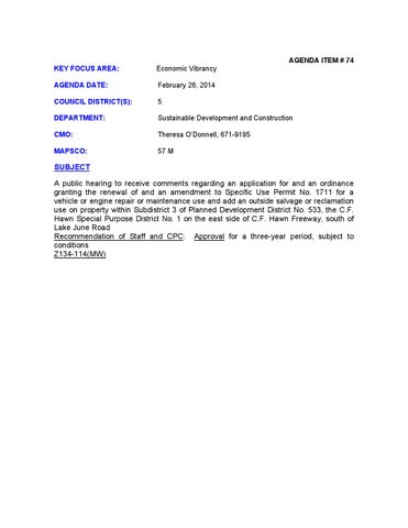 SUBJECT A public hearing to receive comments regarding an application for and an ordinance granting the renewal of and an amendment to Specific Use Permit No. 1711 for a vehicle or engine repair or maintenance use and add an outside salvage or reclamation use on property within Subdistrict 3 of Planned Development District No. 533, the C.F. Hawn Special Purpose District No. 1 on the east side of C.F. Hawn Freeway, south of Lake June Road Recommendation of Staff and CPC: Approval for a three-year period, subject to conditions Z134-114(MW)