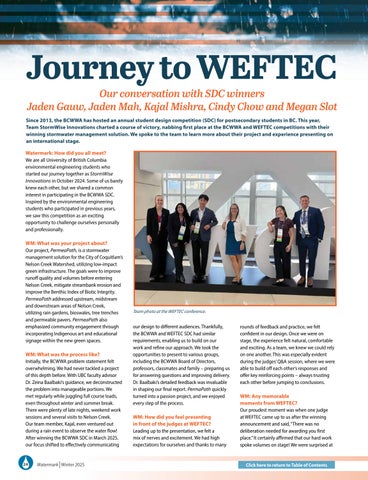 The BCWWA supports a Student Design Competition and the successful team had the opportunity to attend WEFTEC to compete with other student teams for a “Top Spot” on the WEF stage. This year, Team StormWise Innovations competed at WEFTEC and took first place in the Stormwater Division! I was able to spend some time and get to know the student team during the conference. This team is comprised of a fantastic group of dedicated, energetic and enthusiastic individuals who are part of the next generation of the water industry. We are lucky to have them as tomorrow’s leading sections of the workforce. www.ACOStormBrixx.ca