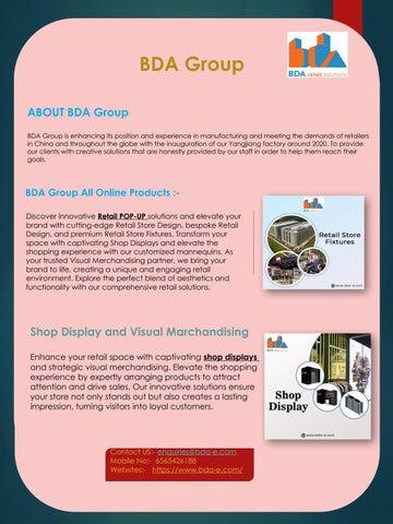 BDA Group All Online Products :Discover innovative Retail POP-UP solutions and elevate your brand with cutting-edge Retail Store Design, bespoke Retail Design, and premium Retail Store Fixtures. Transform your space with captivating Shop Displays and elevate the shopping experience with our customized mannequins. As your trusted Visual Merchandising partner, we bring your brand to life, creating a unique and engaging retail environment. Explore the perfect blend of aesthetics and functionality with our comprehensive retail solutions.