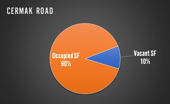 The Roosevelt Road Corridor is improving compared to Q1 & Q2. With 340,348 square feet of commercial space, Roosevelt Road has approximately 30,948 square feet of vacant space. This 9.09% commercial vacancy rate is in the middle of the pack compared to the overall community.