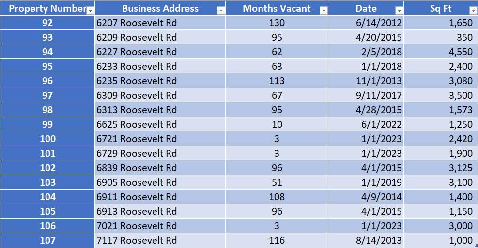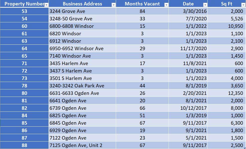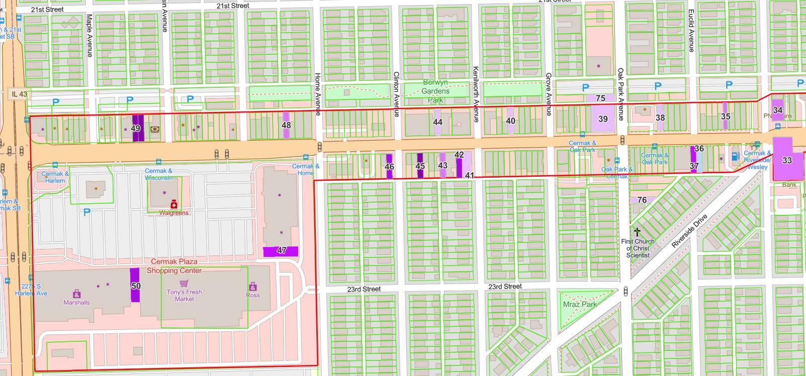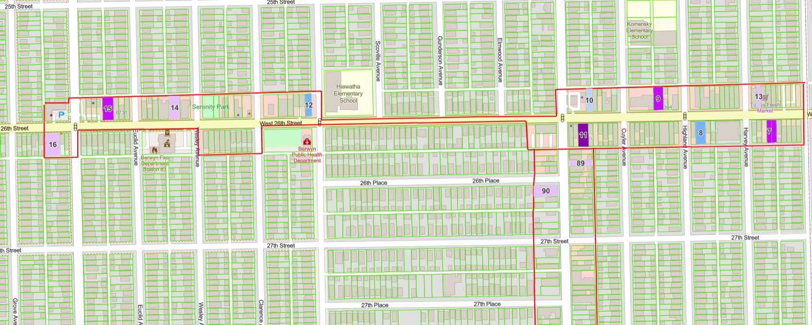 The Berwyn Development Corporation has developed a dynamic tracking map for vacant properties. This report contains maps for Q3 & Q4 of 2022. Since the most recent publishing, the BDC worked closely with Aldermen and the City of Berwyn Fire Department to accurately identify vacant properties. The BDC also worked with City Council to amend the Vacancy Ordinance, which requires property owners to register their vacant properties and obtain adequate insurance. With the base map established, the BDC will continue to update the vacancy map on a semi-annual basis, providing for up-todate reporting about the commercial property health, new tenancy, and target areas for resources and redevelopment.