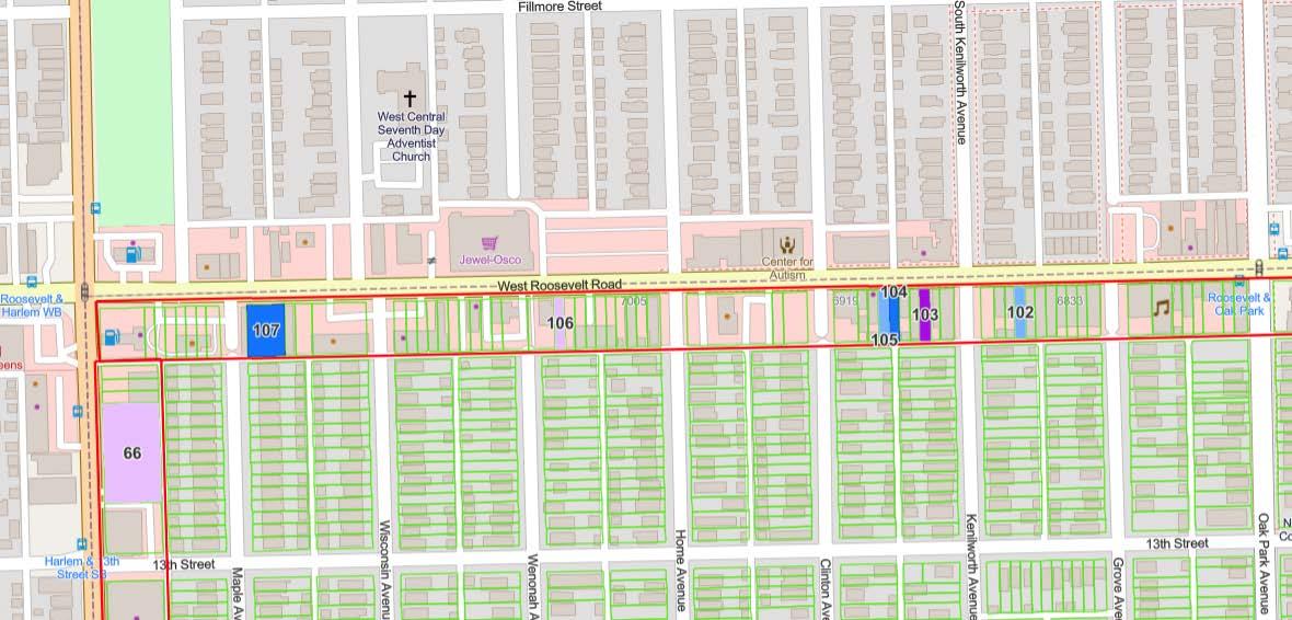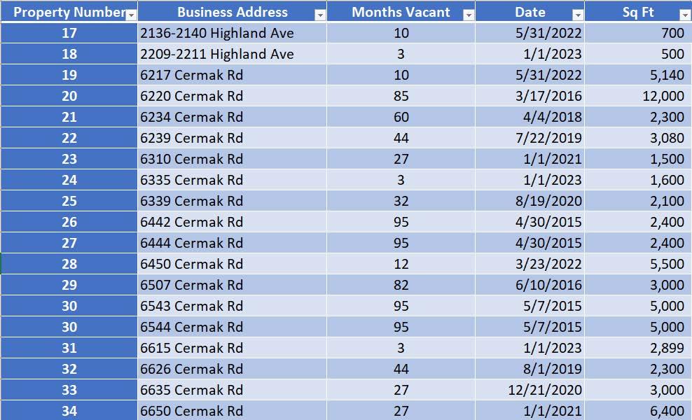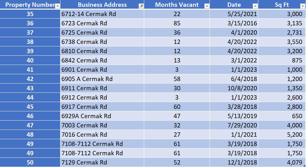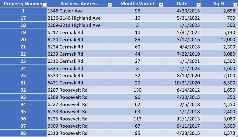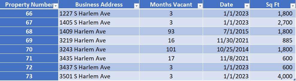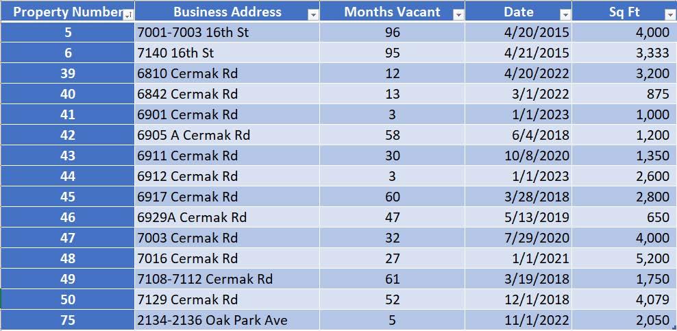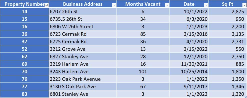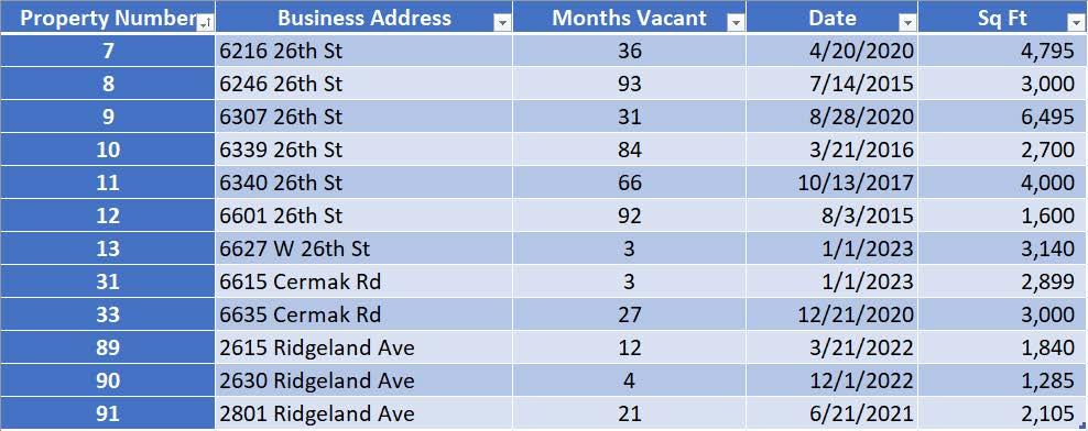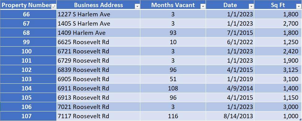 By the BDC’s estimate, Berwyn has approximately 327,442 square feet of vacant commercial property. As seen in the table below, about 30% of Berwyn’s vacant commercial properties are located in the Cermak corridor. Some corridors have a much lower than expected vacancy rate compared to their total commercial square footage (Harlem, as an example) while others have much larger that would be expected (Depot District