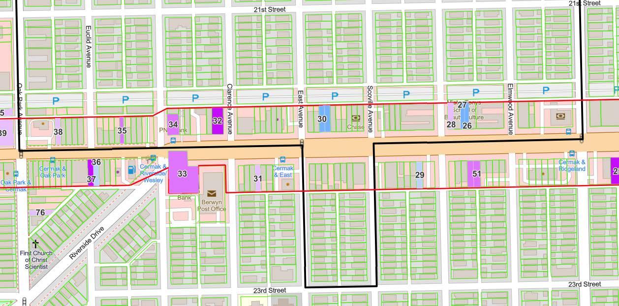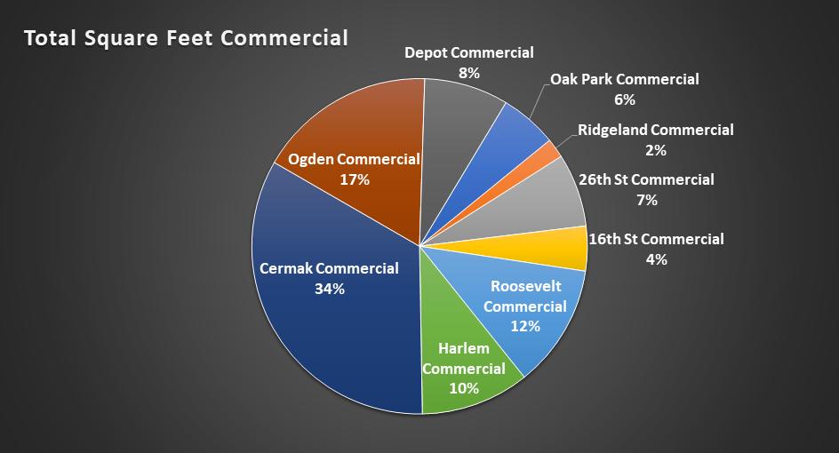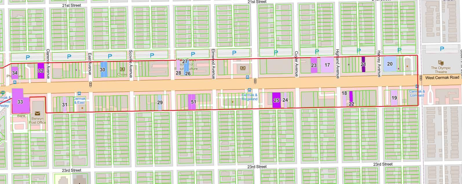 By the BDC’s estimate, Berwyn has approximately 2,862,819 square feet of commercial property*. As seen in the table below, over a third of Berwyn’s commercial property is located in the Cermak corridor. The smallest commercial corridor is Ridgeland, with just 1.88% of all properties.
