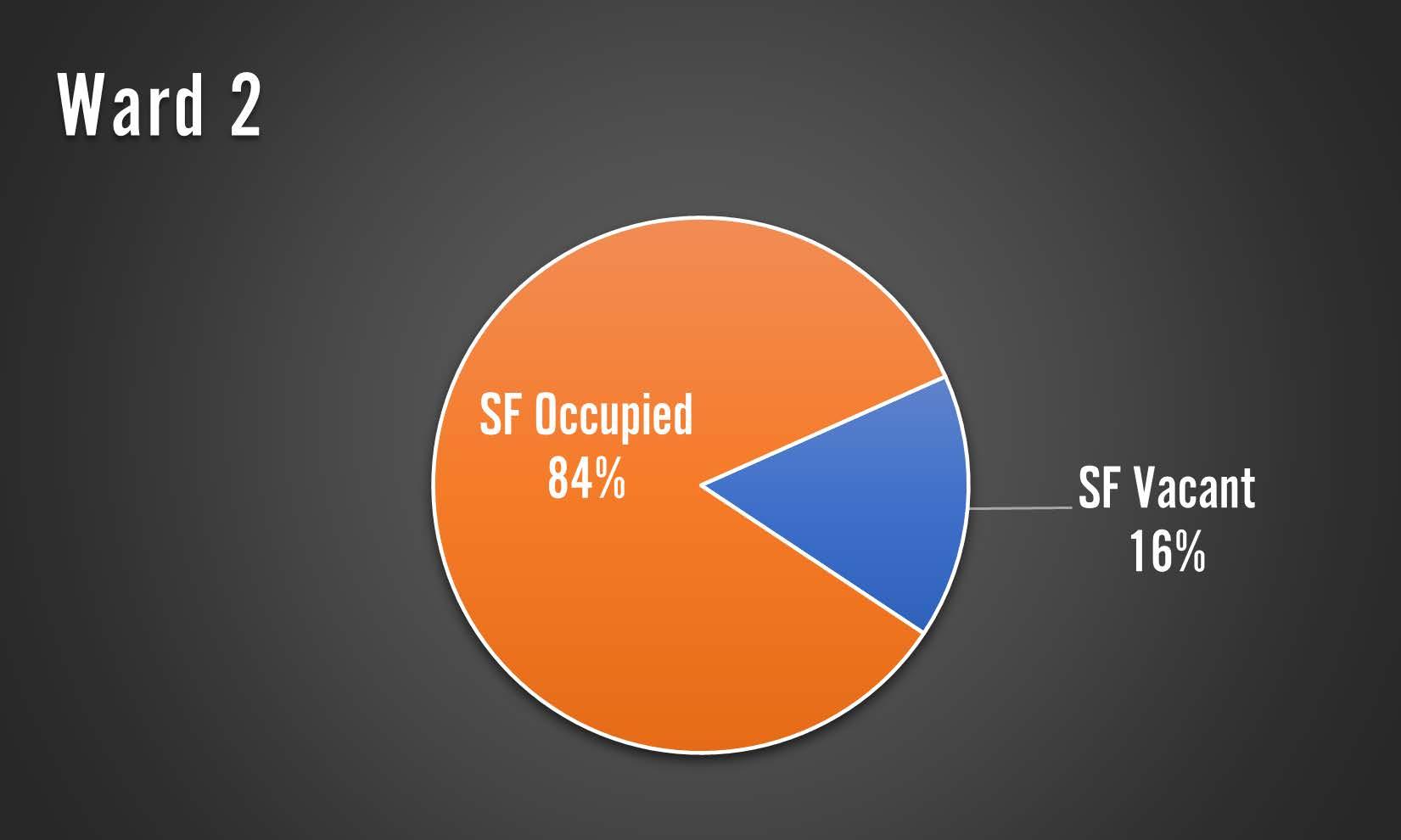 Ward 2 is struggling compared to the overall community. With 296,700 square feet of commercial space, Ward 2 has approximately 43,500 square feet of vacant space. This 15.27%is just higher than the overall commercial vacancy of 11.44%.