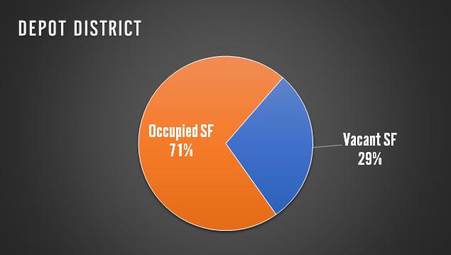 The Depot District Corridor is struggling compared to the overall community. With 232,346 square feet of commercial space, the Depot has approximately 66,926 square feet of vacant space. This 28.80% is the worst commercial vacancy rate.