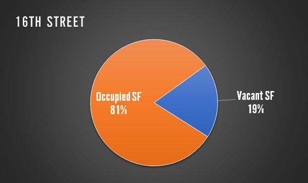 The 16th Street Corridor is one of the most challenged in our community. While 16th Street has the 2nd least amount of commercial space of any corridor, with 123,641 square feet, approximately one in five properties, or 23,522 square feet is vacant. This 19.02% vacancy rate is more than the overall commercial vacancy of 11.44%.