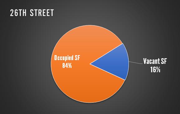The 26th Street Corridor is struggling compared to the overall community. With 202,085 square feet of commercial space, 26th Street has approximately 31,755 square feet of vacant space. This 15.71% is a challenged commercial vacancy rate.