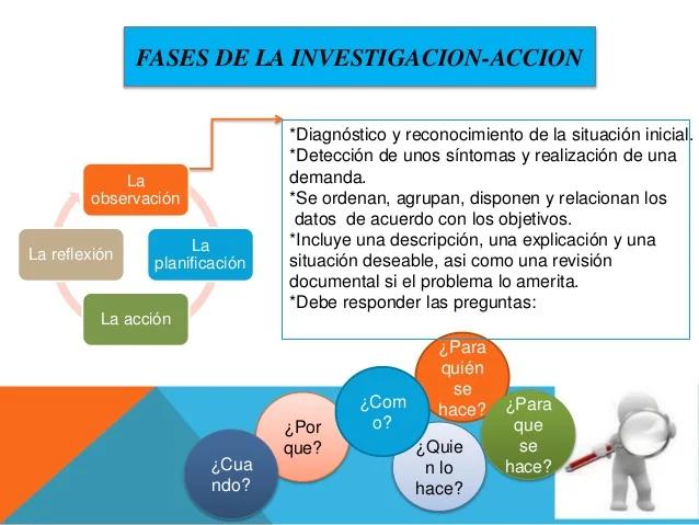 Acción: Unión de teoría y praxis: en el terreno educativo se trata de incorporar la investigación educativa a la práctica escolar, unir educación e investigación. Orientada a la mejora de la acción: en educación, se orienta a mejorar la acción y contribuir a la resolución de problemas con una visión dinámica de la realidad. Reconociendo que los fenómenos educativos se encuentran interrelacionados y son siempre susceptibles de ser mejorados. Se puede considerar como una estrategia de investigación, formación y cambio social. Partir de problemas prácticos: su objeto de estudio son los problemas prácticos, tal y como ocurren en los contextos naturales. Tiene como objetos de investigación los problemas y las preocupaciones que interesan a los educadores o cualquier otro profesional que se interese por situaciones reales y concretas en el ámbito social. No pretende elaborar una ley general o teoría, sino la comprensión de una situación particular y su respectiva solución. Protagonismo del docente: pretende implicar a los docentes, a ser protagonistas de sus investigaciones, en los problemas cotidianos del aula o plantel educativo.