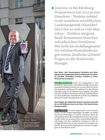 Güstrow in Mecklenburg- Vorpommern hat circa 30 000 Einwohner – Tendenz sinkend. In der nordrhein-westfälischen Landeshauptstadt Düsseldorf leben fast 20-mal so viele Men schen – Tendenz steigend. Beide Kommunen brauchen zukunftssichere Verteilnetze. Was heißt das im Ballungsraum? Vor welchen Herausforderungen stehen ländliche Gebiete? Fragen an die Stadtwerke- Manager. Herr Meier, viele Finanzexperten betrachten eine Beteiligung an der Energieinfrastruktur mittlerweile als riskantes Geschäft. Düsseldorf investiert trotzdem in Netze. Wie passt das zusammen? HANS-GÜNTHER MEIER Gerade das Netzgeschäft ist eine wesentliche Säule unseres Unternehmenserfolgs und unserer Finanzkraft. Deshalb investieren wir in unsere Netze für Strom, Gas, Fernwärme und Wasser. Wir werden hier in den nächsten fünf Jahren mehr als 200 Millionen Euro ausgeben. Der größte Teil davon entfällt auf Fernwärme und Strom. Außerdem bauen wir ein hocheffizientes Gaskraftwerk. Da findet eine erhebliche Modernisierung des Energiesystems statt.