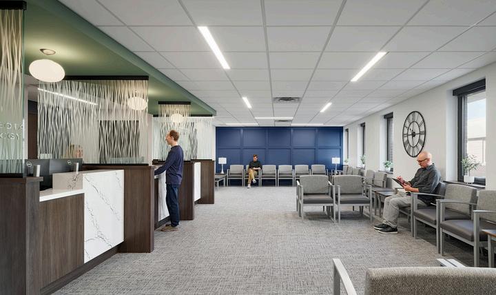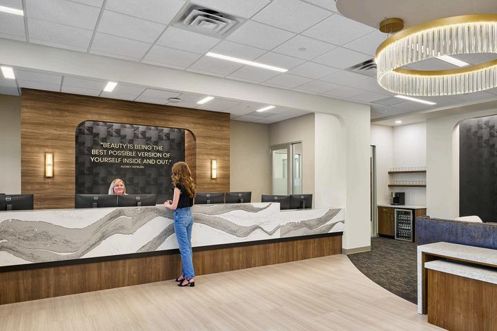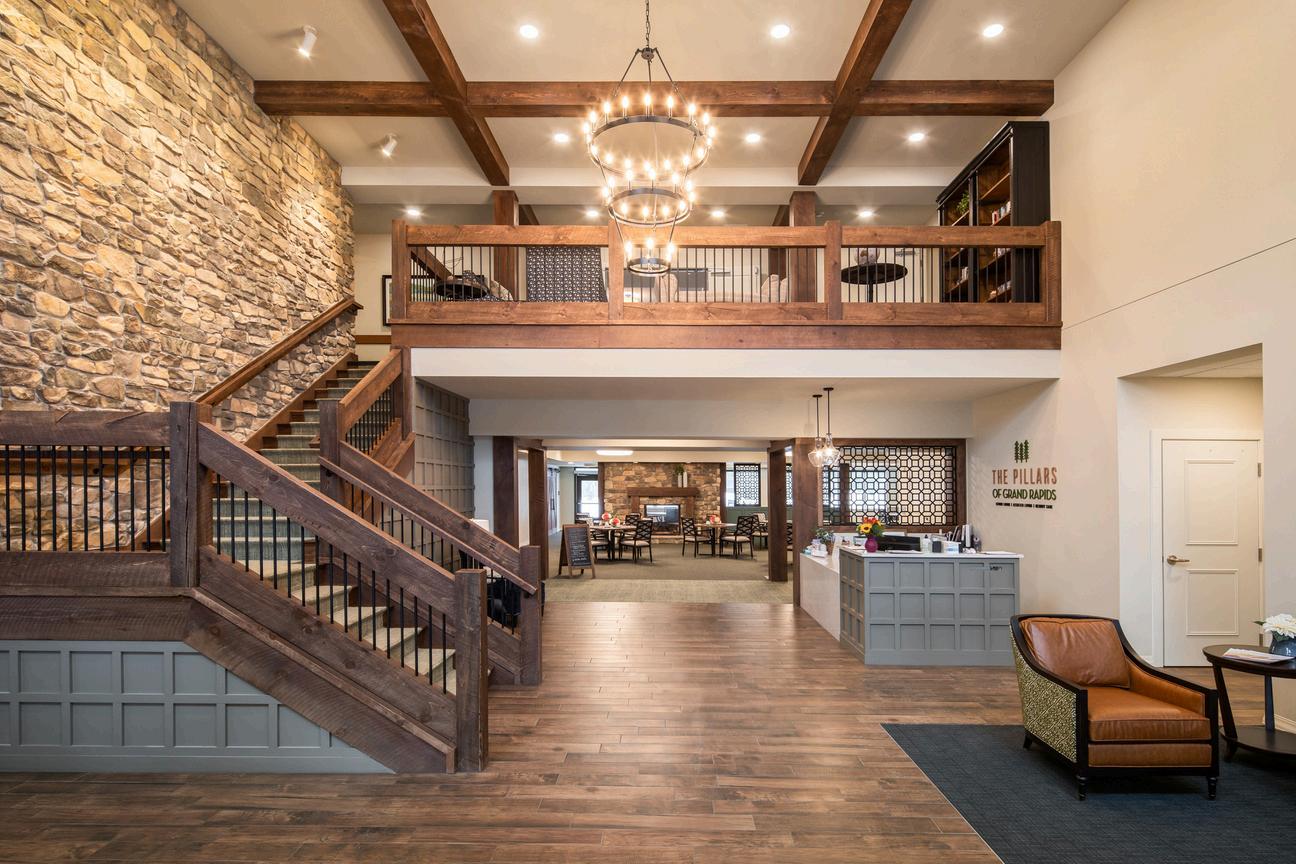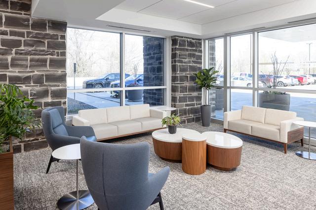 Inviting medical building characterized by a visually captivating staircase, comfortable ancillary furniture groupings, and timeless design elements