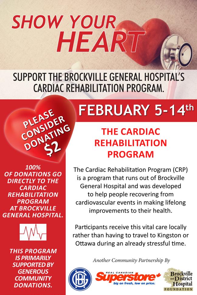 The Cardiac Rehabilitation Program operates out of Brockville General Hospital for patients who have received bypass surgery, valve replacements, stents, transplants, or pacemaker installations. There is no cost to participate in the program that consists of stress management, exercise counselling, dietary education, and even support to quit smoking. It is important to note that the CRP receives minimal government funding and exists primarily on the generous support of donors and committees of people raising funds to allow the program to continue. The program costs $180,000 annually to run. If not for the CRP, those patients would need to travel to Ottawa or Kingston at great expense and time, or worse, they would not receive the help at all.