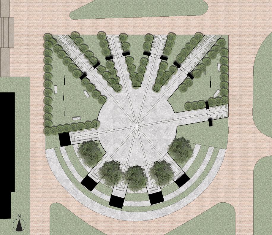 The five silhouettes represent the following: The Plumber, The Electrician, The Chef, The Landscaper, and The Custodian. A bronze finish is used for the portals to honor them and their work. Once you arrive at the center of the memorial, there are five seating areas, each aligned with their respective portal, which allows for a moment of reflection as you look back at the silhouettes. The ground plane and seating area take the form of a stone hand to symbolize the rough condition of the hands of blue-collar workers due to the work they perform daily. The stone hand also supports the entire memorial space on the ground plane and seating areas as a way to memorialize the support they provide to the campus and our greater society.