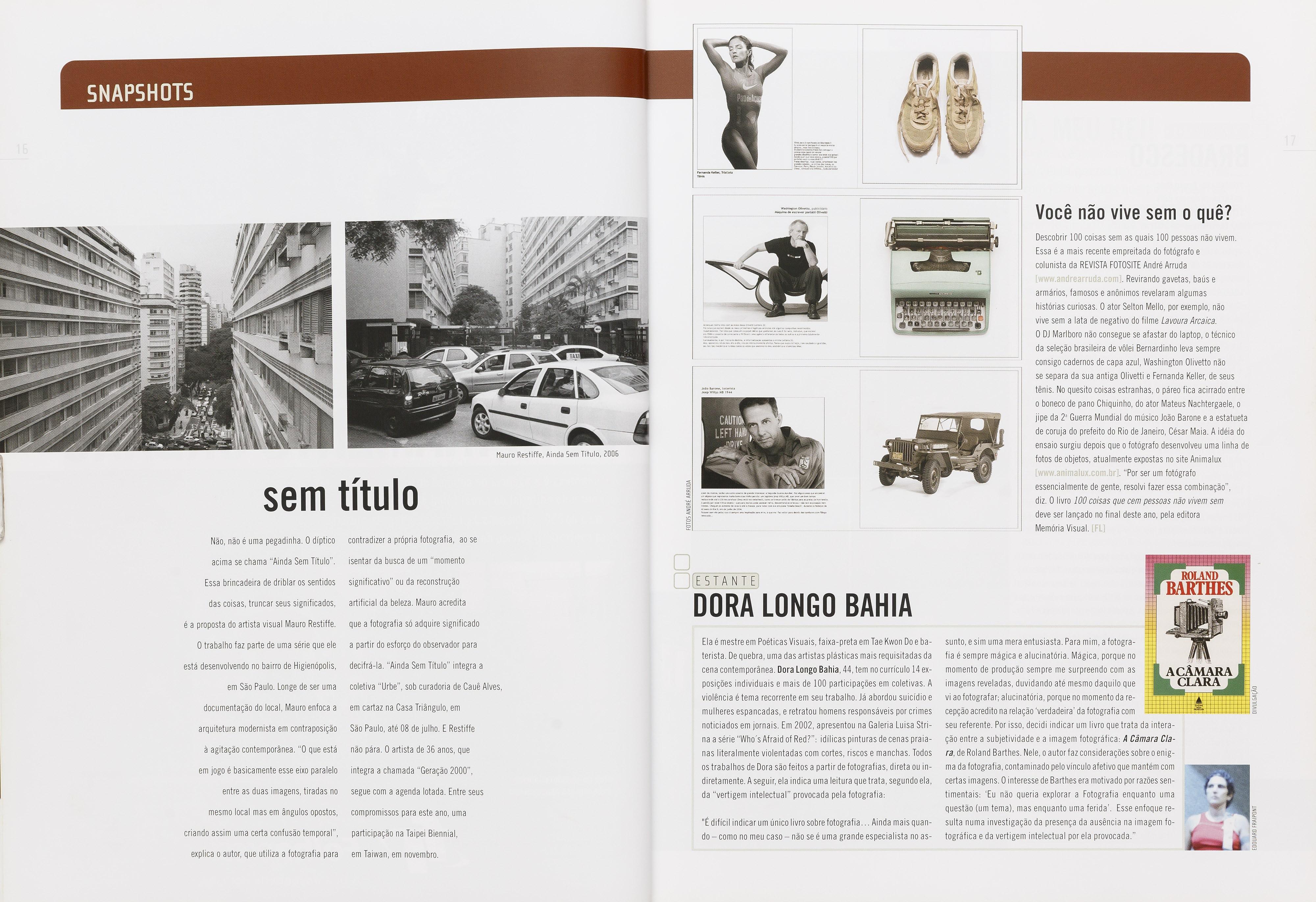 contradizer a própria fotografia, ao se isentar da busca de um momento significativo ou da reconstrução artificial da beleza. Mauro acredita que a fotografia só adquire significado a partir do esforço do observador para decifrá-la. Ainda Sem Título integra a coletiva Urbe , sob curadoria de Cauê Alves, em cartaz na Casa Triângulo, em São Paulo, até 08 de julho. E Restiffe não pára. O artista de 36 anos, que integra a chamada Geração 2000 , segue com a agenda lotada. Entre seus compromissos para este ano, uma participação na Taipei Biennial, em Taiwan, em novembro.