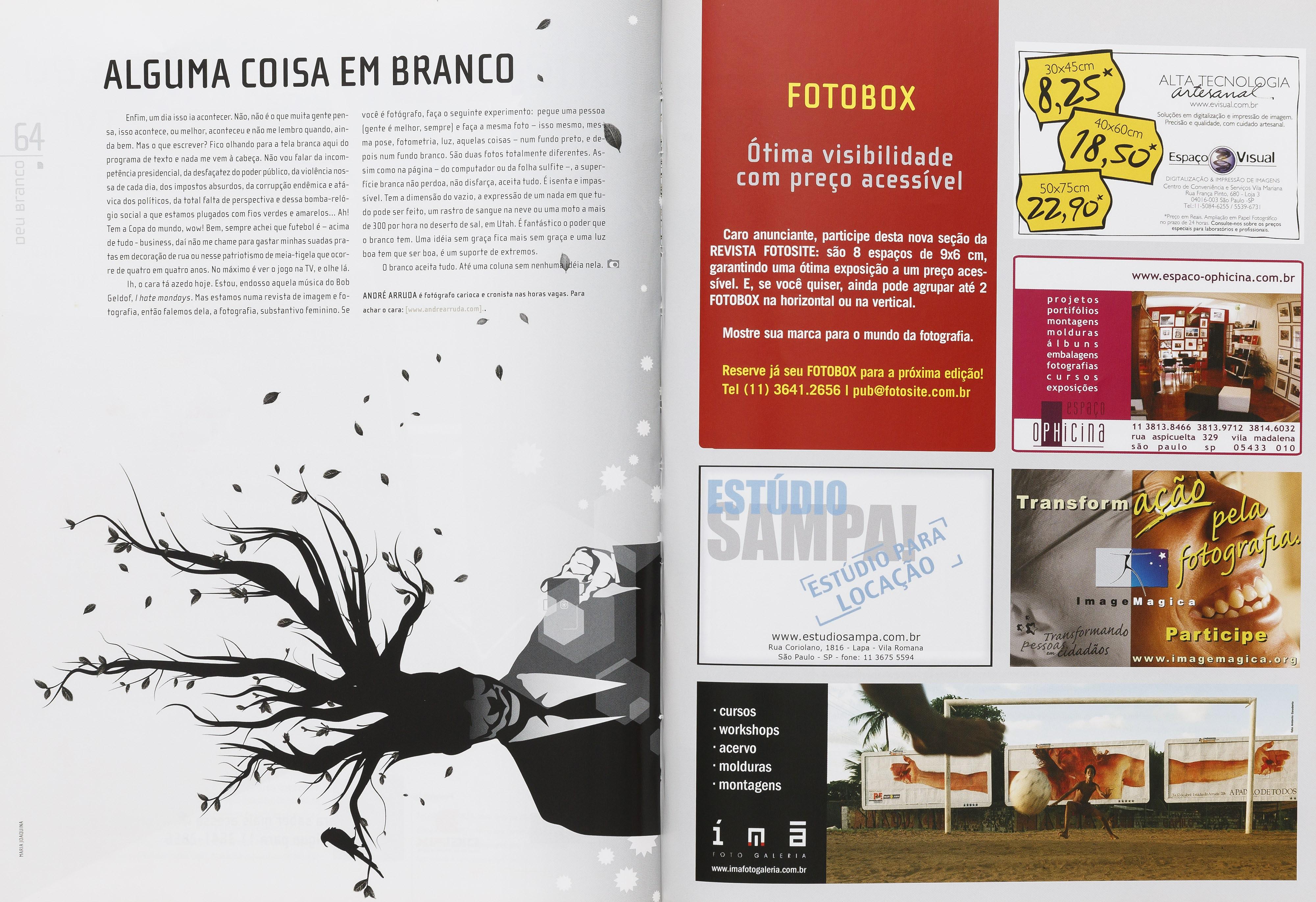 Enfim, um dia isso ia acontecer. Não, não é o que muita gente pensa, isso acontece, ou melhor, aconteceu e não me lembro quando, ainda bem. Mas o que escrever? Fico olhando para a tela branca aqui do programa de texto e nada me vem à cabeça. Não vou falar da incompetência presidencial, da desfaçatez do poder público, da violência nossa de cada dia, dos impostos absurdos, da corrupção endêmica e atávica dos políticos, da total falta de perspectiva e dessa bomba-relógio social a que estamos plugados com fios verdes e amarelos... Ah! Tem a Copa do mundo, wow! Bem, sempre achei que futebol é acima de tudo - business, daí não me chame para gastar minhas suadas pratas em decoração de rua ou nesse patriotismo de meia-tigela que ocorre de quatro em quatro anos. No máximo ver o jogo na TV, e olhe lá. lh, o cara tá azedo hoje. Estou, endosso aquela música do Bob Geldof, hate mondays. Mas estamos numa revista de imagem e fotografia, então falemos dela, a fotografia, substantivo feminino. Se